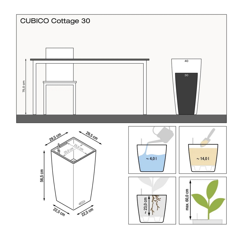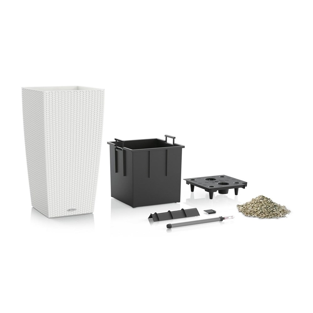 Высокое кашпо прямоугольной формы с фактурной поверхностью имитирующей плетение ротанга, в комплект входит внутреннее кашпо, индикатор уровня воды, субстрат Lechuza-pon. С помощью дополнительной подставки на колесиках, кашпо легко перемещать, в независимости от посаженных растений.