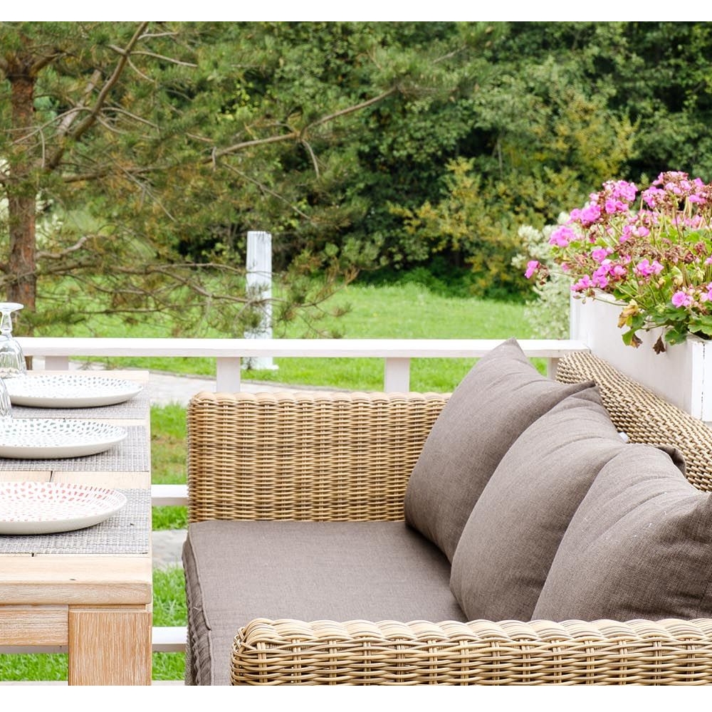 Размеры: 222*86*81 см Плетенный садовый диван выполнен из искусственного круглого ротанга в нескольких цветах: соломенный, коричневый, бежевый и графит. Подушки в серо-коричневом цвете входят в комплект. Каркас выполнен из алюминия.