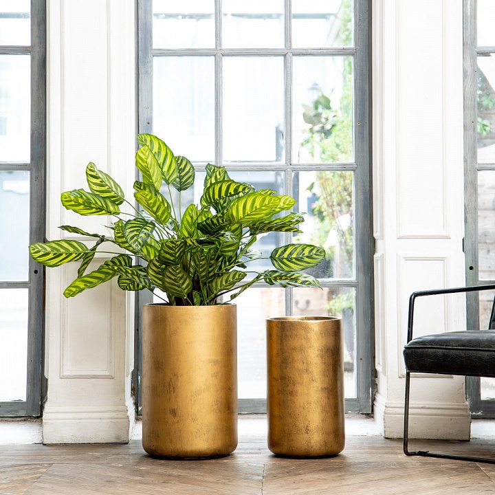 Кашпо выполнено в форме цилиндра, в 2х оттенках: состаренное серебро и состаренное золото, в 3х размерах.