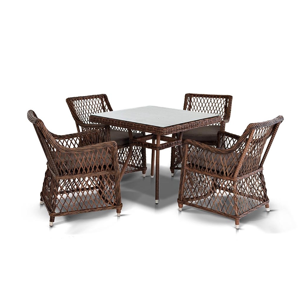 Комплект выполнен из искусственного ротанга. Столешница – стекло.