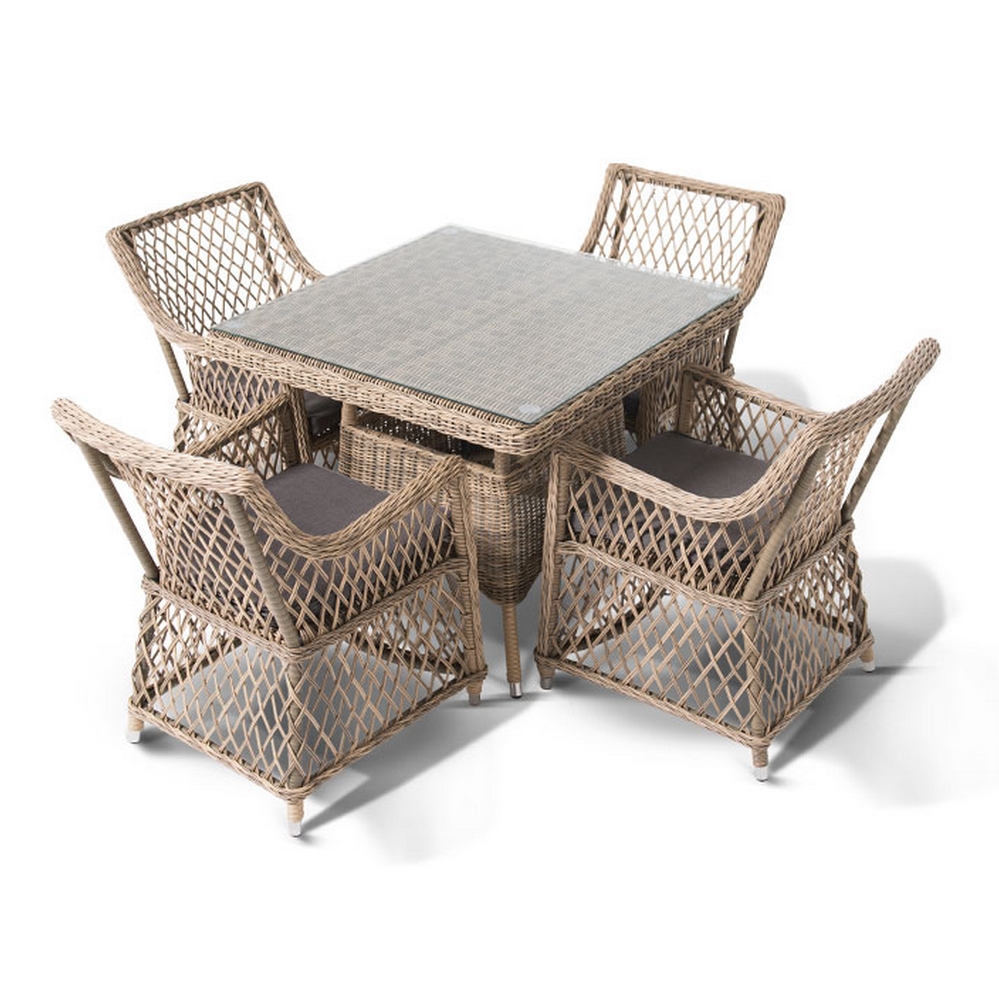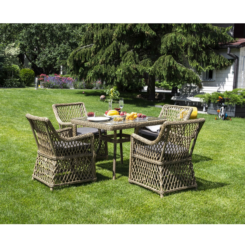 Комплект выполнен из искусственного ротанга. Столешница – стекло.