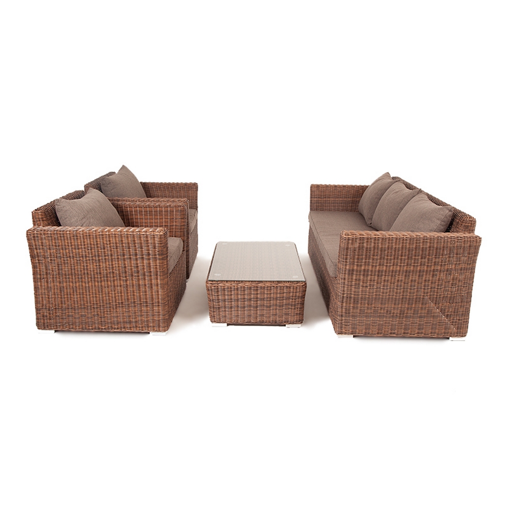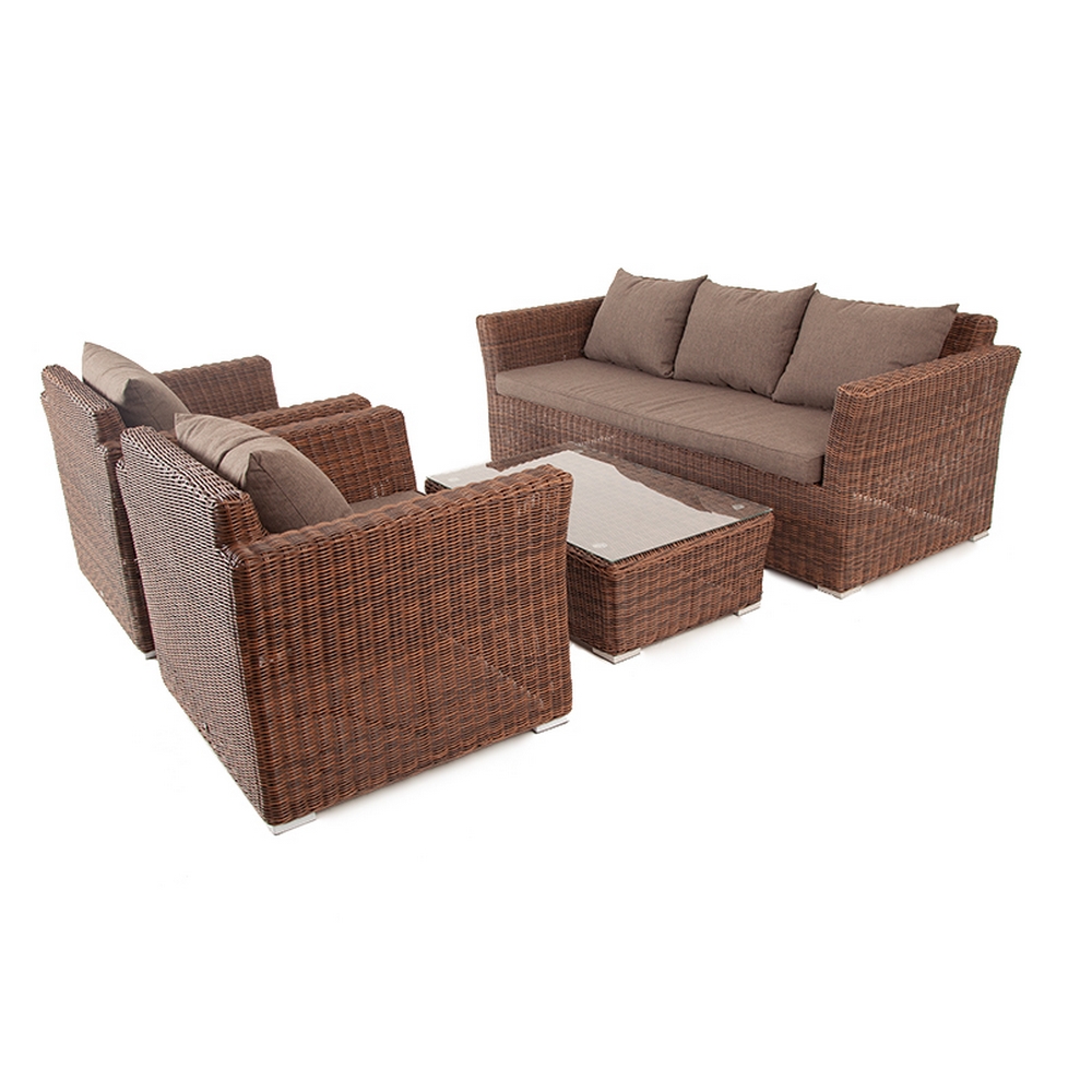 Комплектация: 3х местный диван, 2 кресла, журнальный столик Комплект выполнен из круглого искусственного ротанга на алюминиевом каркасе. В комплект включены подушки с серо-коричневыми чехлами. Диван: Ширина: 222 см, Глубина: 86 см, Высота: 81 см Кресло: Ширина: 104 см, Глубина: 86 см, Высота: 81 см Стол: Длина: 110 см, Ширина: 66 см, Высота: 34 см