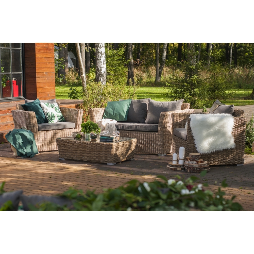 Комплектация: 2х местный диван, 2 кресла, журнальный столик Комплект выполнен из круглого искусственного ротанга на алюминиевом каркасе. В комплект включены подушки с серо-коричневыми чехлами. Диван: Ширина: 170 см, Глубина: 86 см, Высота: 81 см Кресло: Ширина: 104 см, Глубина: 86 см, Высота: 81 см Стол: Длина: 110 см, Ширина: 66 см, Высота: 34 см