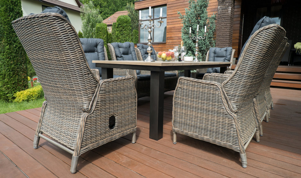 Комплект выполнен из искусственного ротанга в коричневом цвете.