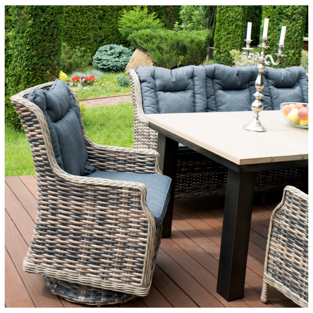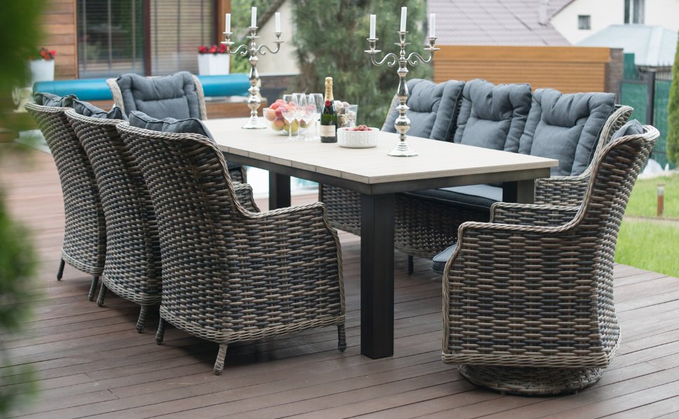 Комплектация: 3х местный диван, 3 кресла, 2 кресла с вращающимся механизмом, обеденный стол