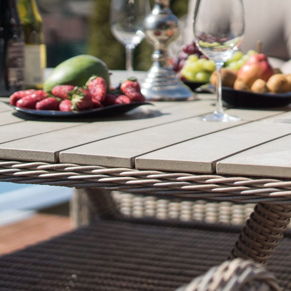 Комплект выполнен из искусственного ротанга. Столешница - имитация дерева (nonwood)