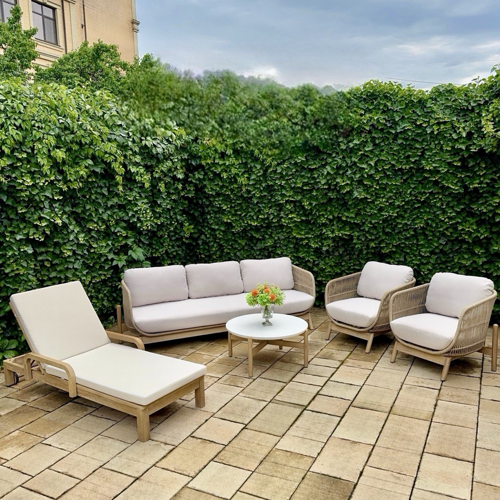 Ткань подушек - олефин, наполнитель - толстый поролон. Материалы устойчивы к УФ-излучению и другим погодным воздействиям.