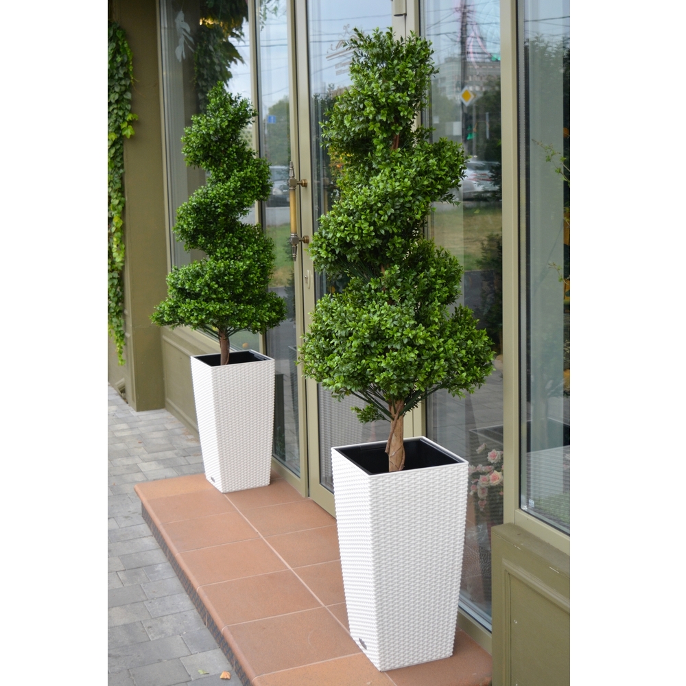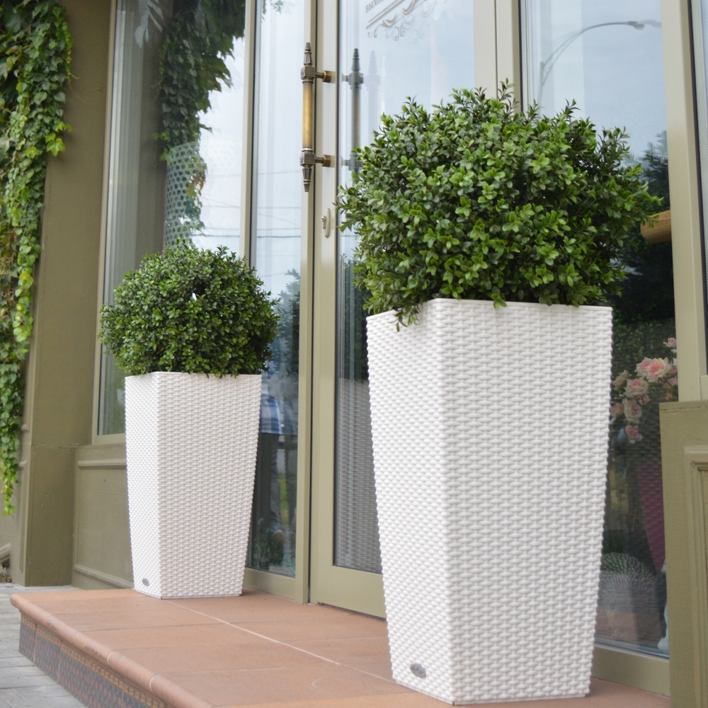 Высокое кашпо прямоугольной формы с фактурной поверхностью имитирующей плетение ротанга, в комплект входит внутреннее кашпо, индикатор уровня воды, субстрат Lechuza-pon. С помощью дополнительной подставки на колесиках, кашпо легко перемещать, в независимости от посаженных растений.