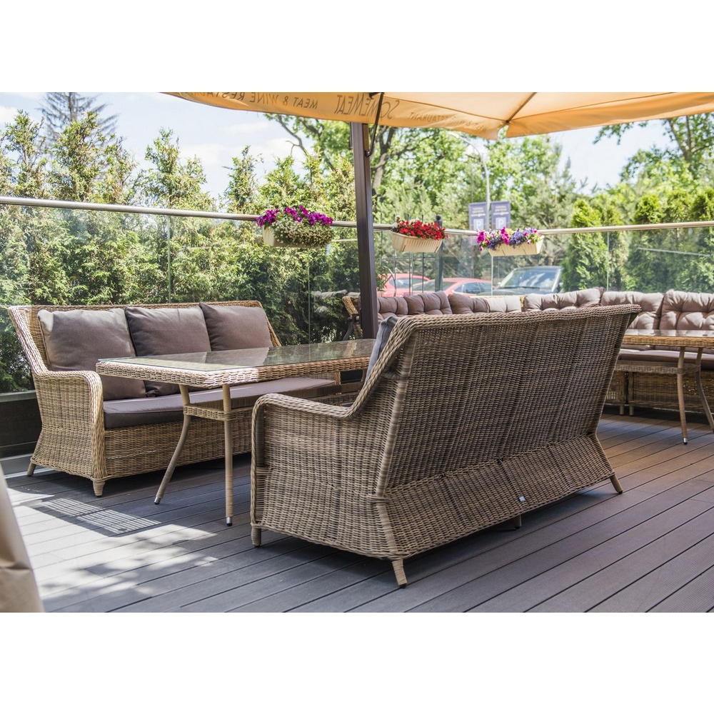 Размер: 190*88*99 см Диван выполнен в классическом стиле из искусственного округлого ротанга. Каркас - алюминий Подушки в серо-коричневом цвете входят в комплект.