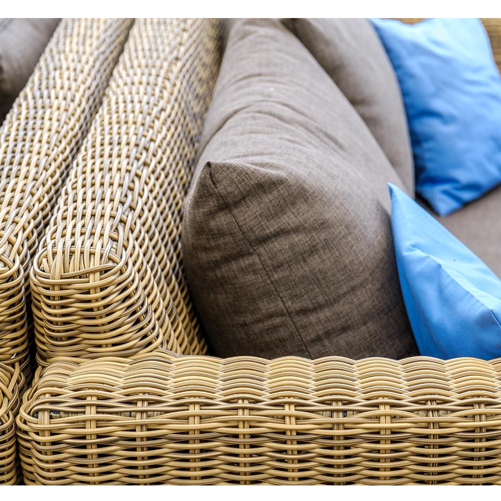Размер: 170*86*81 см Садовый диван выполнен из искусственного ротанга в нескольких цветах: соломенный, коричневый, бежевый, графит Подушки в серо-коричневом цвете входят в комплект (чехлы съемные, полиэстер)