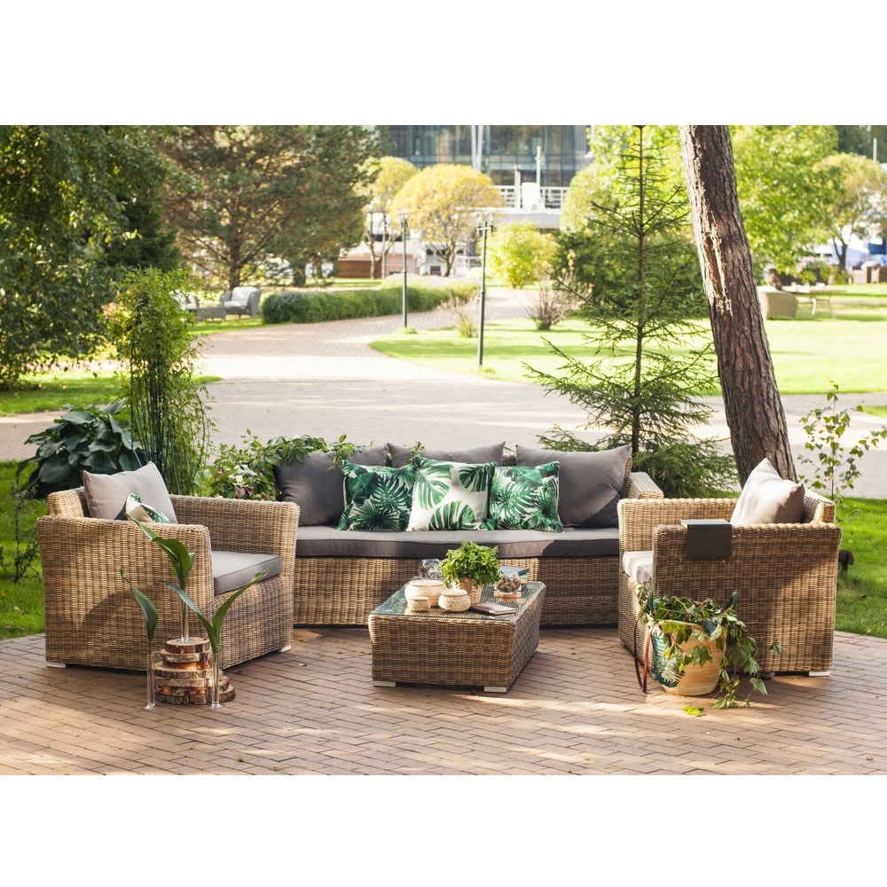 Размеры: 222*86*81 см Плетенный садовый диван выполнен из искусственного круглого ротанга в нескольких цветах: соломенный, коричневый, бежевый и графит. Подушки в серо-коричневом цвете входят в комплект. Каркас выполнен из алюминия.