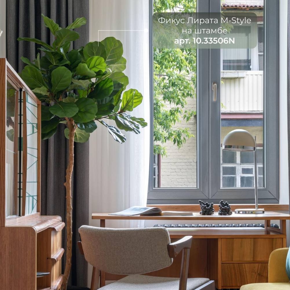 Искусственный фикус лирата 180 и 220 см, выполнен на штамбе из натурального дерева. Листья крупные, насыщенно зеленые.