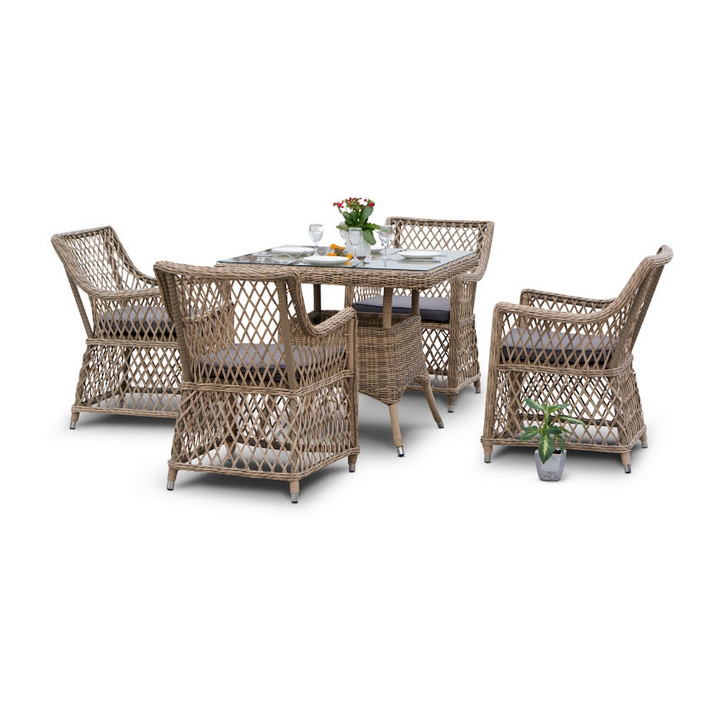 Комплект выполнен из искусственного ротанга. Столешница – стекло.