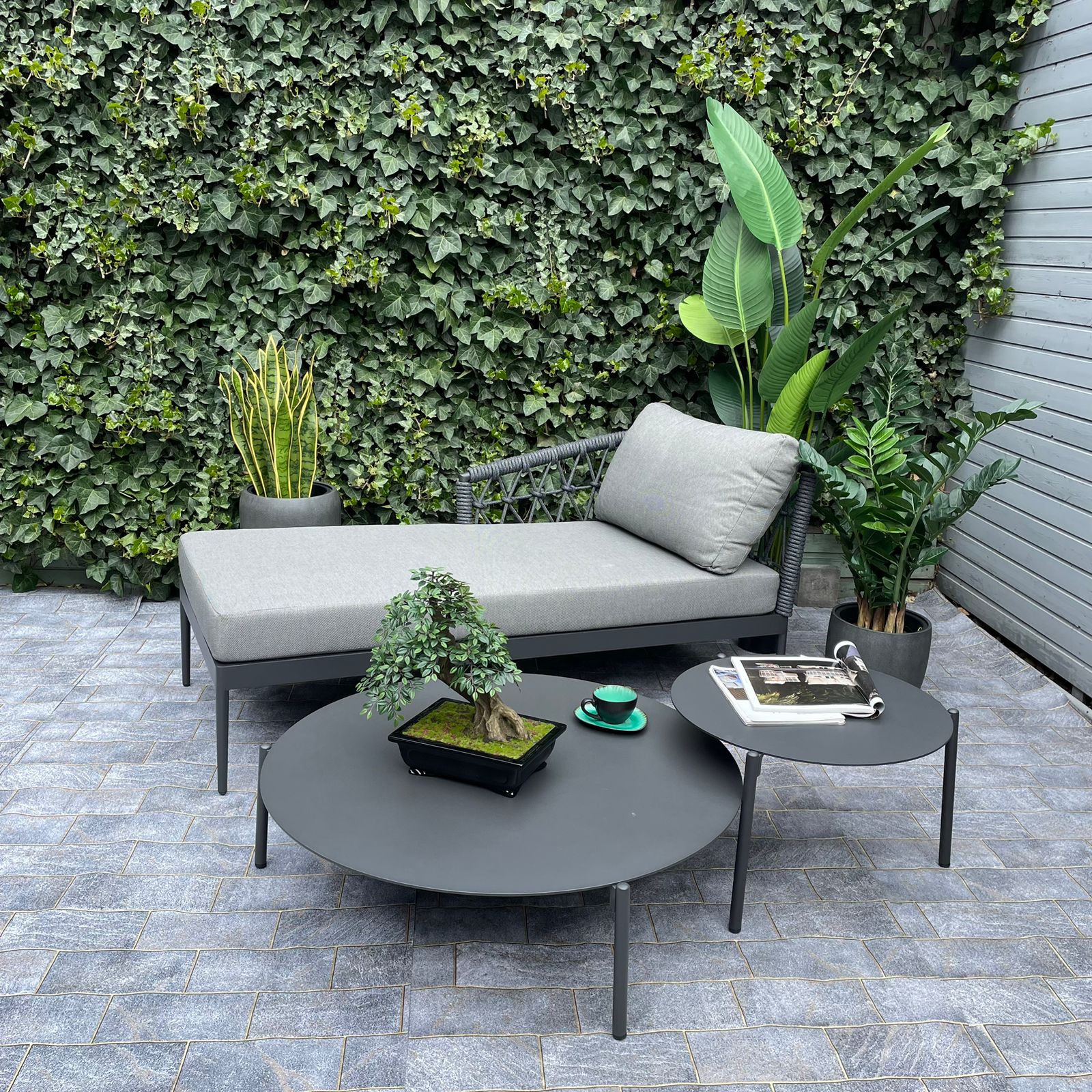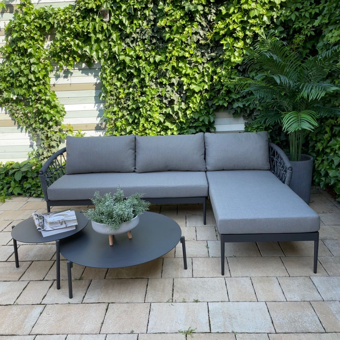 Комплектация: кушетка, угловой диван, 2 круглых столика Комплект выполнен из синтетической веревки - роуп. В комплект включены подушки. Размер: Диван: Ширина: 173 см, Глубина: 81 см, Высота: 75 см Кушетка: Ширина: 171 см, Глубина: 85 см, Высота: 75 см Стол L: Диаметр 104 см, Высота: 29 см Стол M: Диаметр 70 см, Высота: 50 см