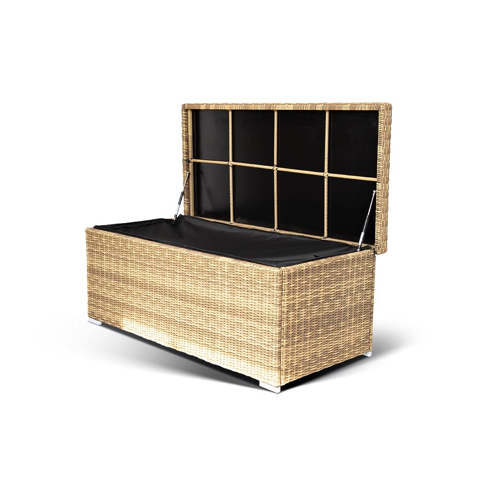 Вместительный сундук из плоского искусственного ротанга соломенного оттенка.